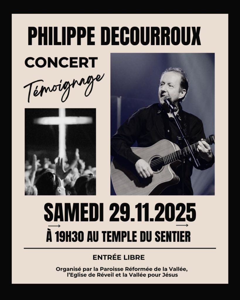 Concert Témoignage + Ajouter à mon Agenda Google + iCal / Outlook export 00 jours 00 heures 00 minutes 00 secondes Date Nov 29 2025 Heure 19:30 Lieu Temple du Sentier Grand-Rue 42, 1347 Sentier Partagez cet événement